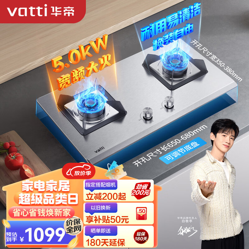 华帝(VATTI)燃气灶天然气灶家用嵌入式易洁耐用不锈钢面板台嵌两用双眼灶台 5.0kW猛火换灶不改孔 JZT-i10065A价格:1098.00元!