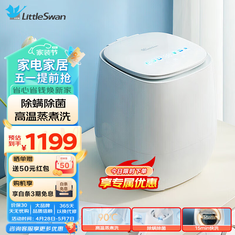 小天鹅(LittleSwan)0.5KG内衣洗衣机 迷你波轮全自动婴儿洗衣机 高温蒸煮洗除菌除螨 灵动炫彩屏不锈钢内桶 TNB5VD0WE价格:1199.00元!