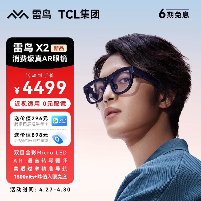 雷鸟X2智能AR眼镜 真无线全彩双目XR眼镜 智能翻译 导航拍照 便携式交互眼镜 Ring套装价格:4999.00元!