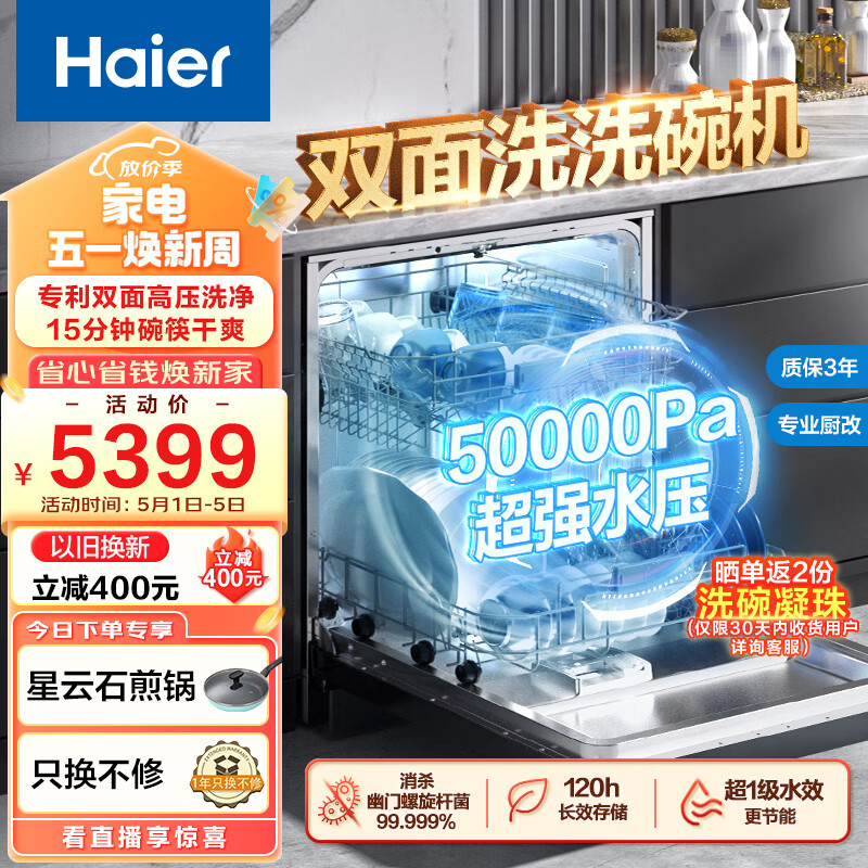海尔(Haier)15套嵌入式双面洗洗碗机W50变频双一级水效 三重洁净 智能开门速干EYBW152266CWU1价格:5399.00元!