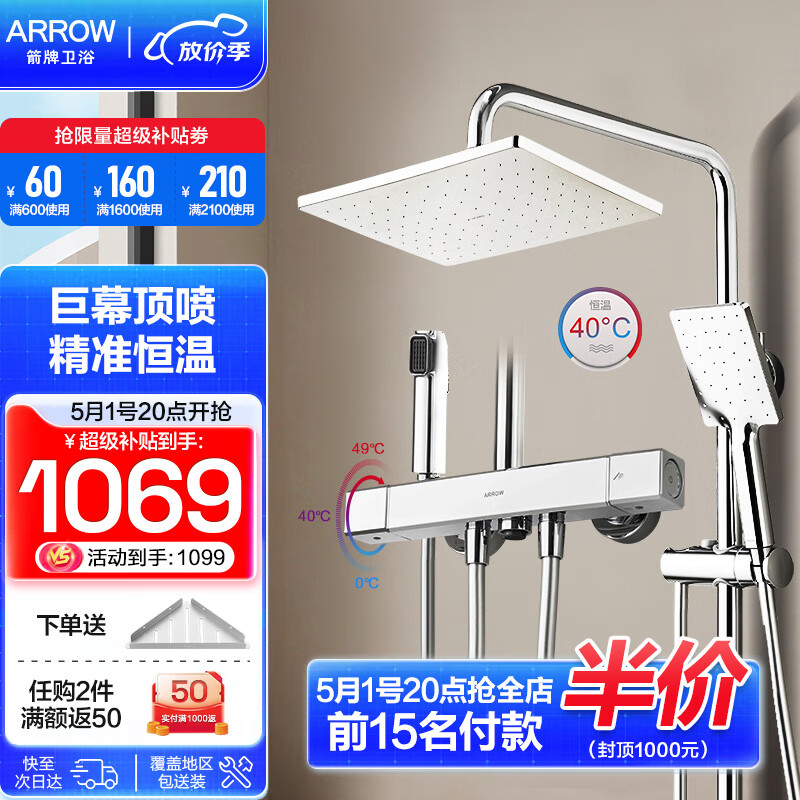 箭牌(ARROW)恒温花洒全套大顶喷洗浴洗澡淋浴喷头升降多功能喷枪莲蓬头套装 四功能恒温花洒34136MHCP价格:1519.00元!