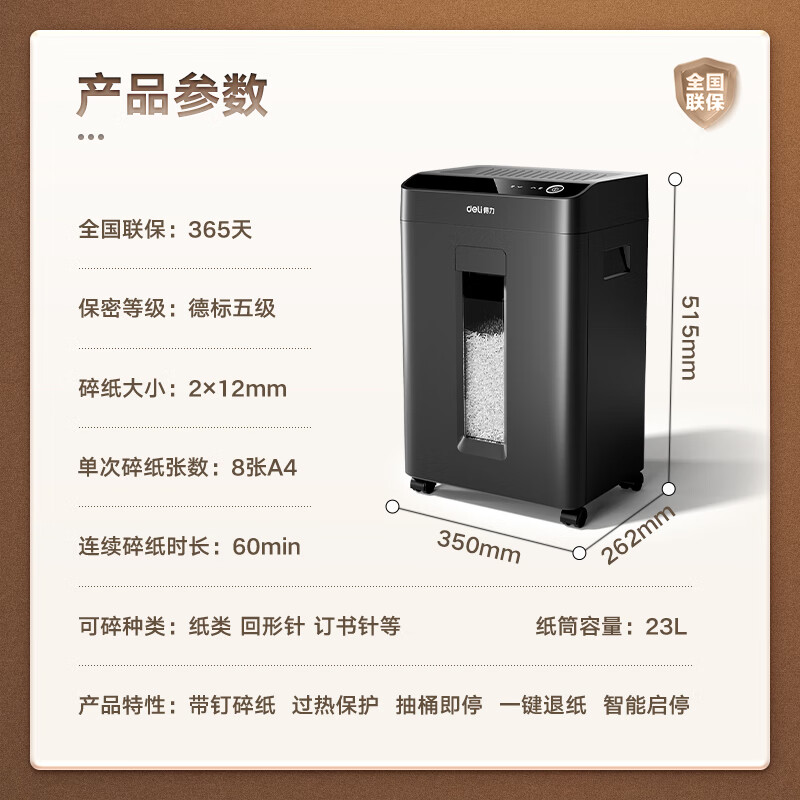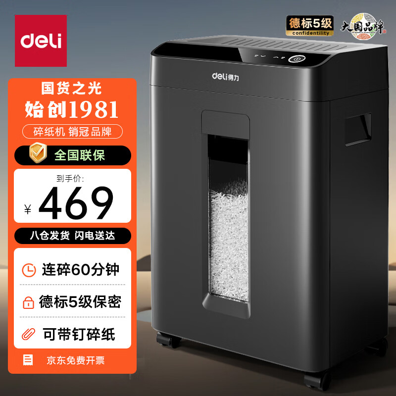 得力碎纸机 5级高保密 触屏操作 商用办公长时间碎纸机 大型文件粉碎机GA508(60分钟持久碎 单次8张)价格:509.00元!