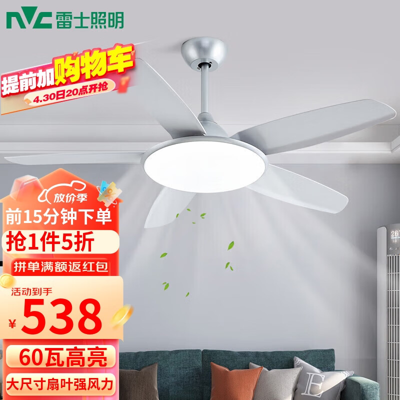雷士(NVC)风扇灯大尺寸开叶吊扇灯简约客厅餐厅变频六档强劲风银色高亮60瓦价格:1075.00元!