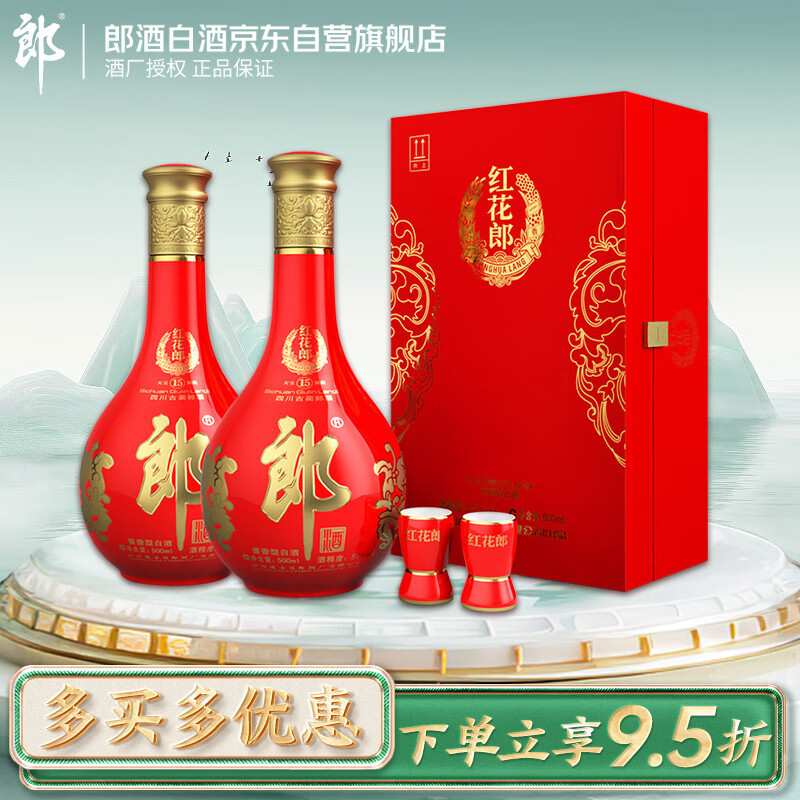 郎酒 红花郎15 酱香型 白酒 53度 500ml单支礼盒*2瓶 【婚宴用酒】价格:1172.00元!