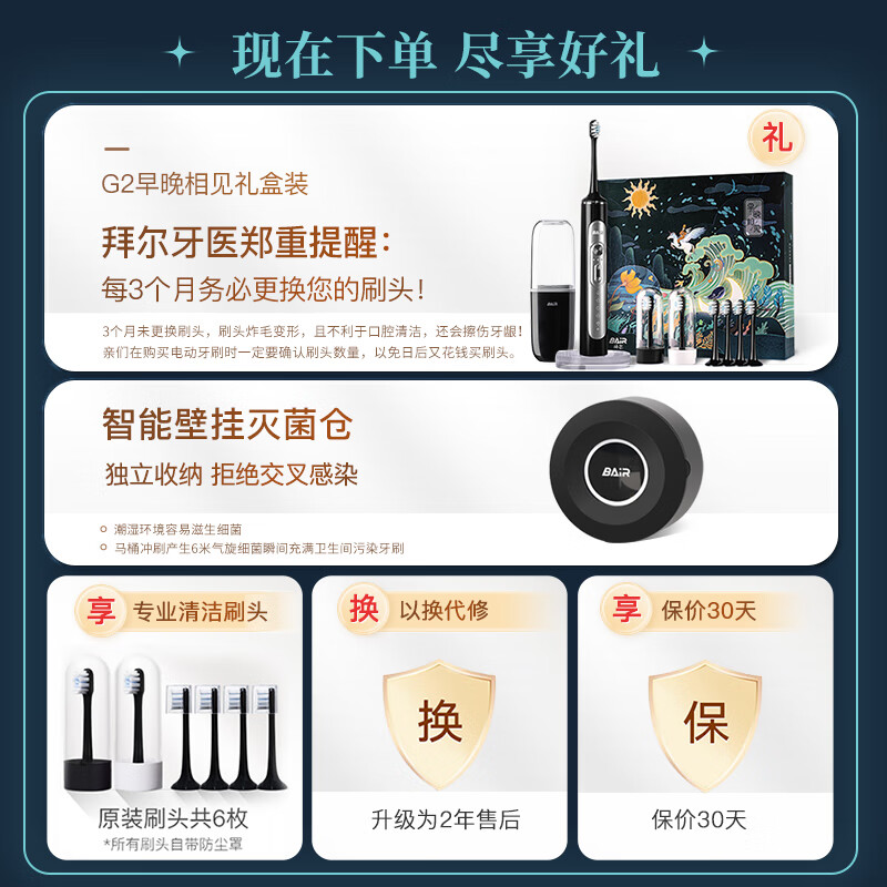 拜尔(BAIR)G2 Pro 高端消毒旗舰机 电动牙刷成人震动充电智能声波学生情侣全自动男士女送朋友礼物 礼盒装 魅力黑【G2 Pro 豪华灭菌款】价格:288.00元!