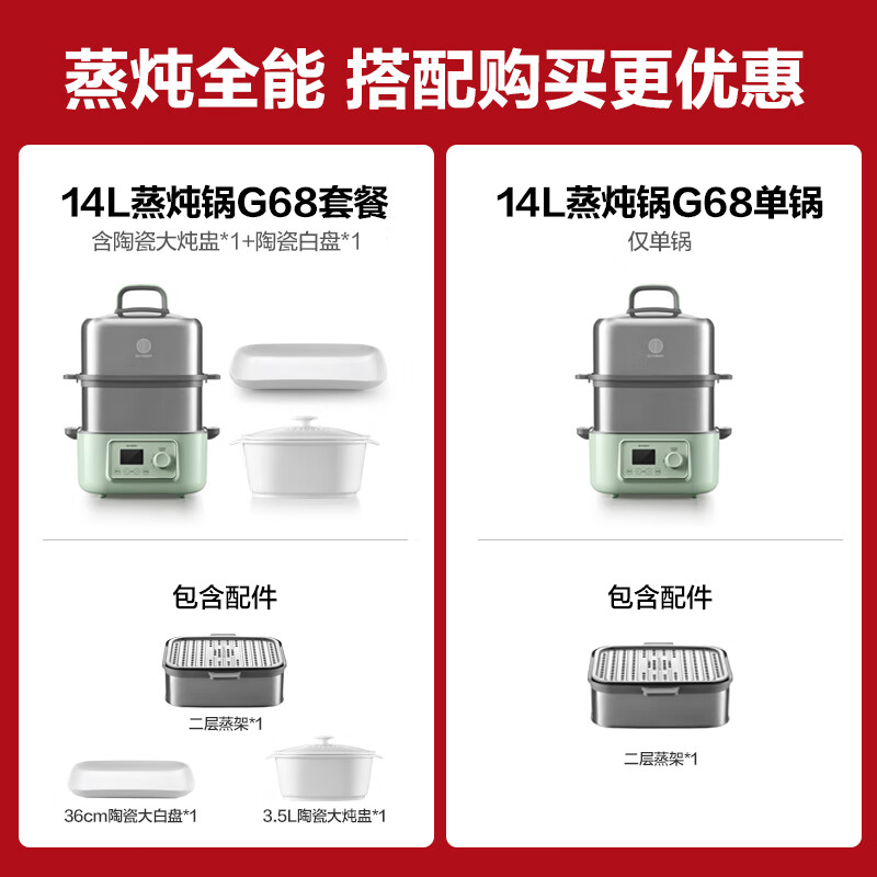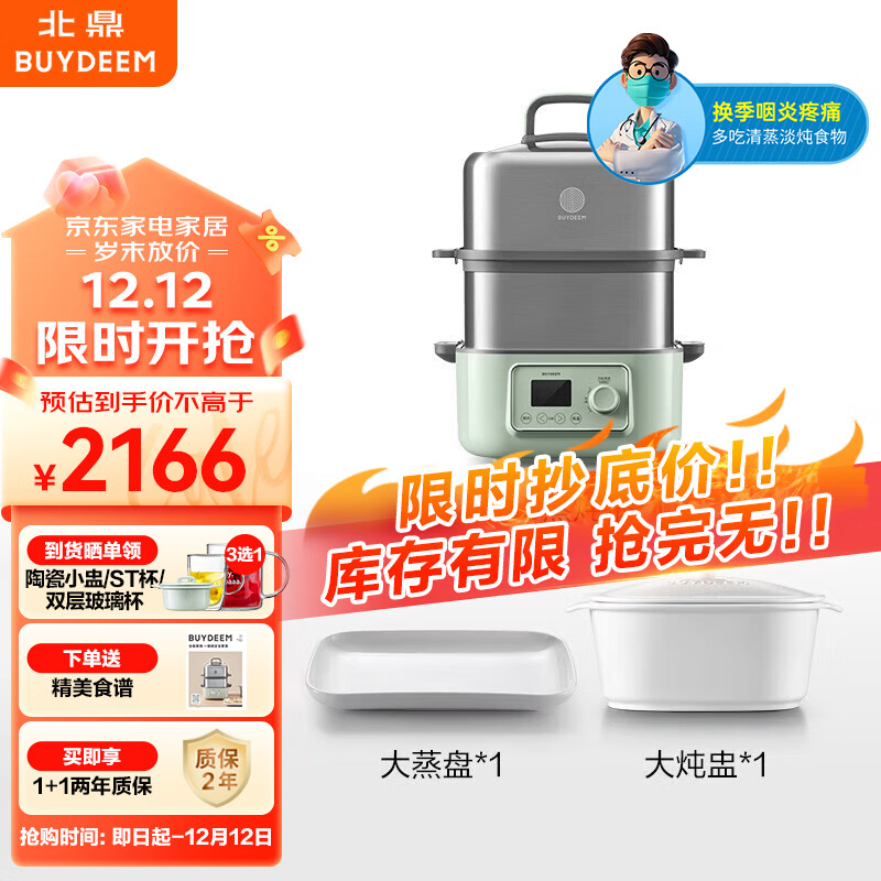 北鼎(Buydeem) 蒸炖锅家用电蒸锅全自动预约家用多用途锅【浅杉绿G68】(含二层蒸架)蒸炖锅+大炖盅+大蒸盘价格:2166.00元!