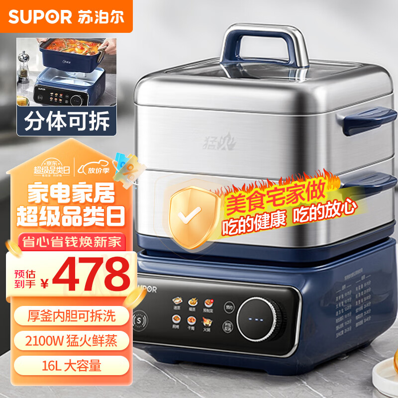 苏泊尔(SUPOR)电蒸锅 电煮锅 电火锅 多用途锅家用多功能蒸煮电热锅16升可拆洗内胆ZN26FC836价格:478.00元!