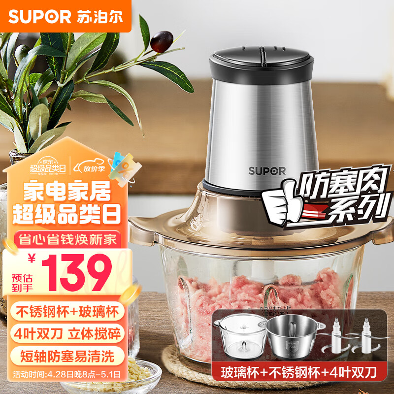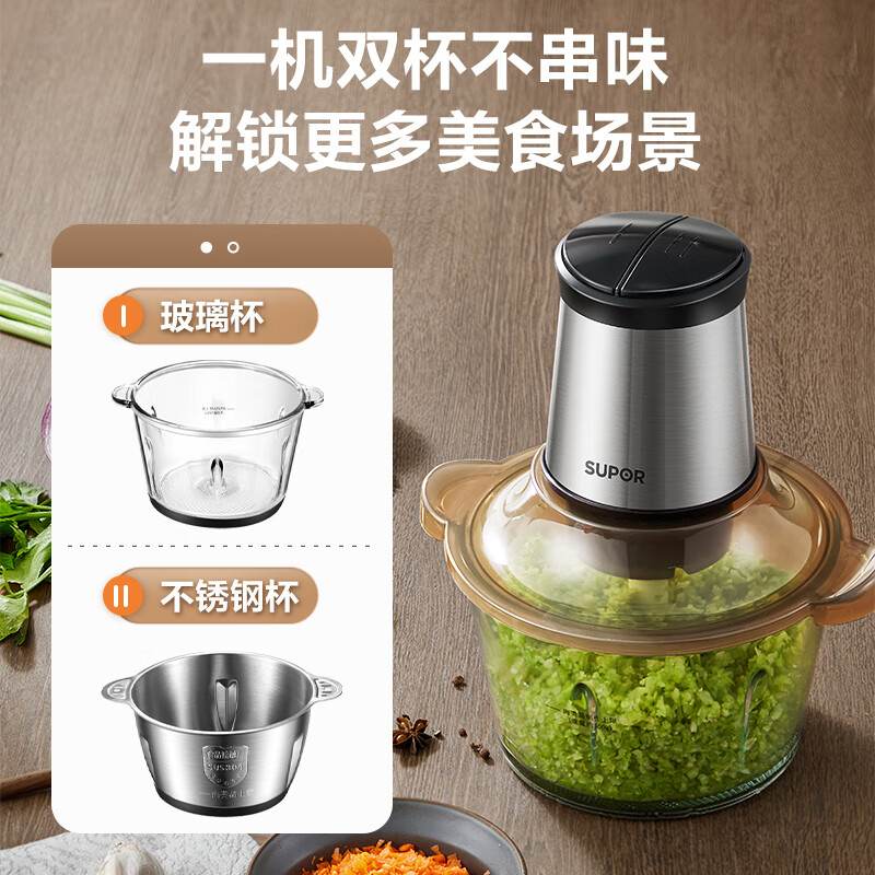 苏泊尔(SUPOR)绞肉机家用电动碎肉机小型多功能切菜绞肉绞馅机打肉机搅拌料理机玻璃不锈钢双杯 JR05SD价格:139.00元!