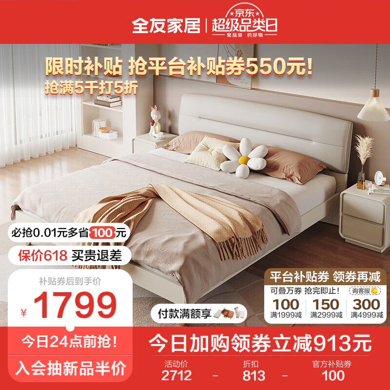 全友家居 床现代轻奢肤感科技布床双人床1.8x2米卧室软靠大床DG10001价格:2712.86元!