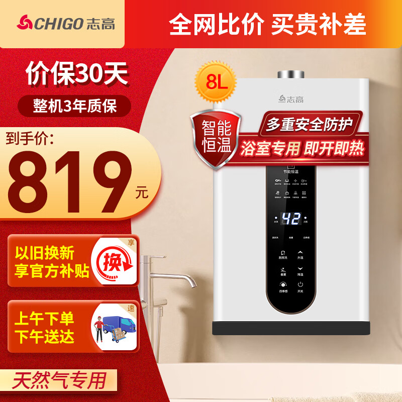 志高(CHIGO)燃气热水器平衡机式热水器 8升家用可装浴室天然气低压启动节能省气速热恒温 JSG16-S(VP-B148)价格:819.00元!