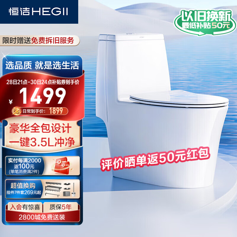 恒洁(HEGII)马桶143 超旋风大冲力一键速冲除污连体坐便器HC0143DT-305价格:1859.00元!