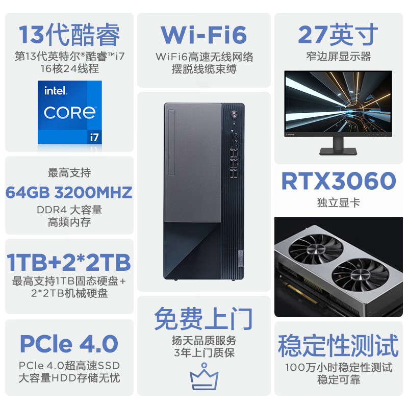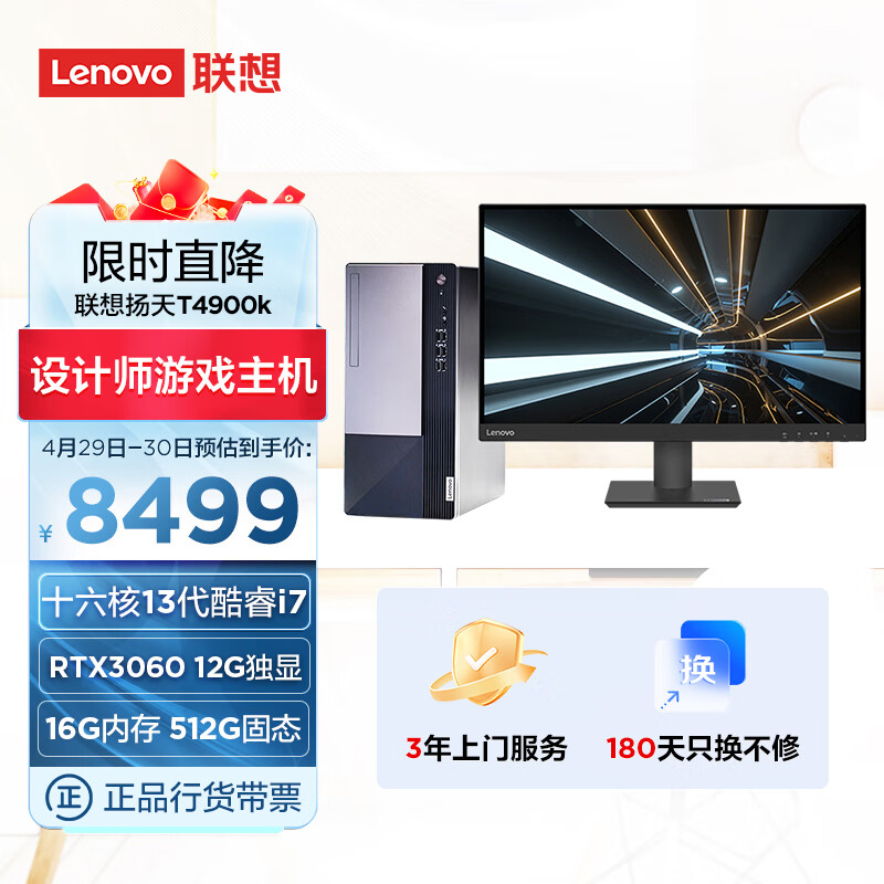 联想(Lenovo)T4900k 13代酷睿i7 设计师商用高性能游戏台式电脑主机(i7-13700 RTX3060 12G 16G 512G)27英寸价格:8499.00元!