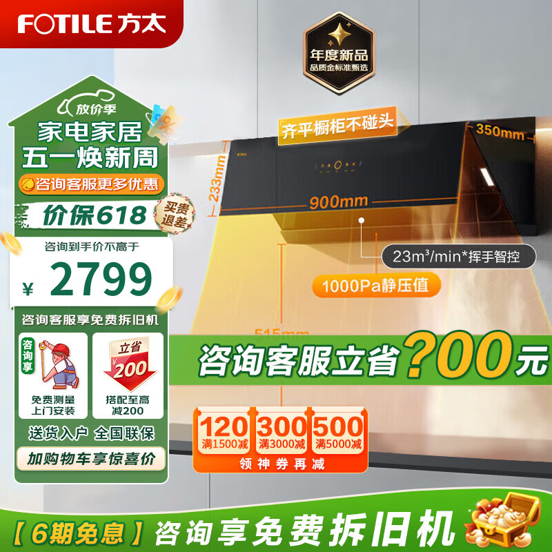 方太(FOTILE)侧吸式油烟机 抽吸油烟机家用厨房变频直流脱排油烟机 23大吸力挥手智控空间大 JCD10TB JCD10TB 单烟机价格:2799.00元!