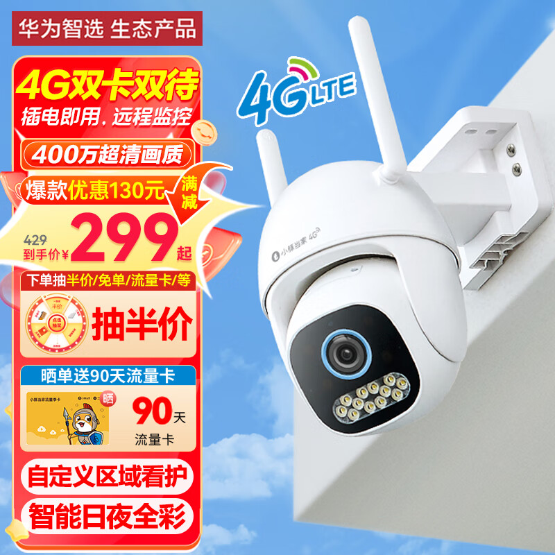 华为智选 小豚当家4G版2.5K室外摄像头家用400万 双卡双待监控器360度无死角带夜视全景户外防水高清可对话价格:429.00元!