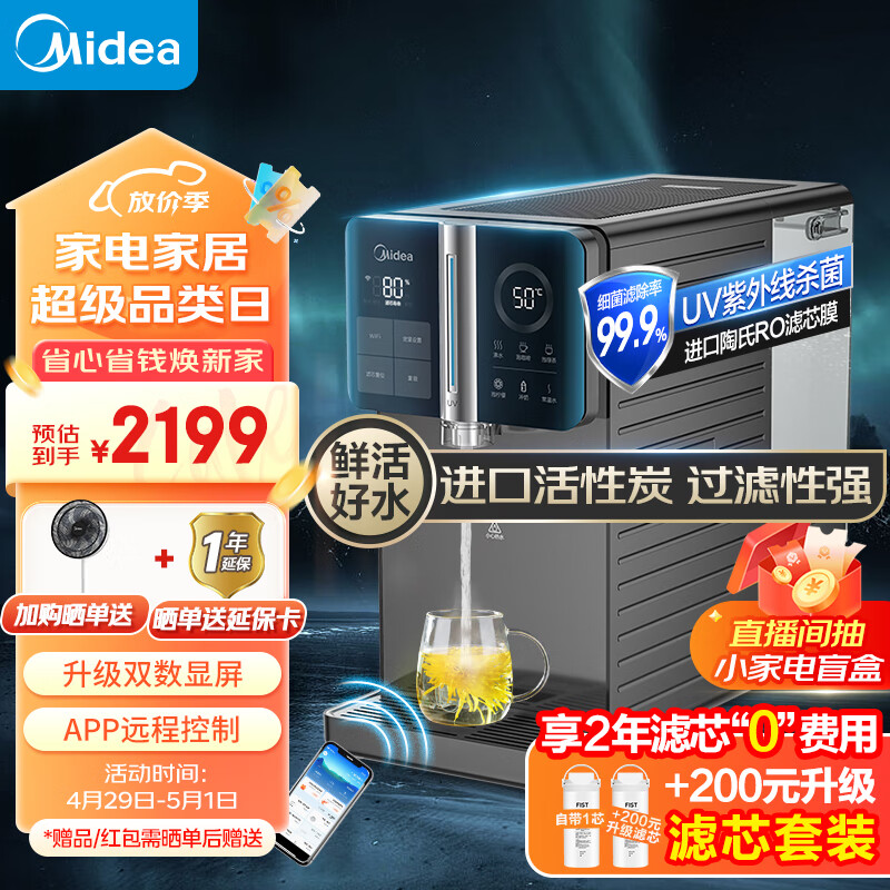 美的(Midea)台式加热净水器饮水机家用 即热式直饮机净饮一体机 RO反渗透过滤器净水机JR2185T-RO极光价格:2199.00元!