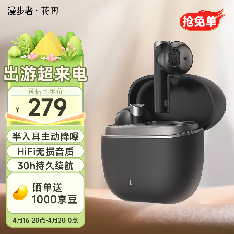 漫步者花再Magic ANC 真无线蓝牙耳机 半入耳主动降噪音乐运动游戏耳麦适用于安卓苹果华为小米手机 石墨灰价格:299.00元!