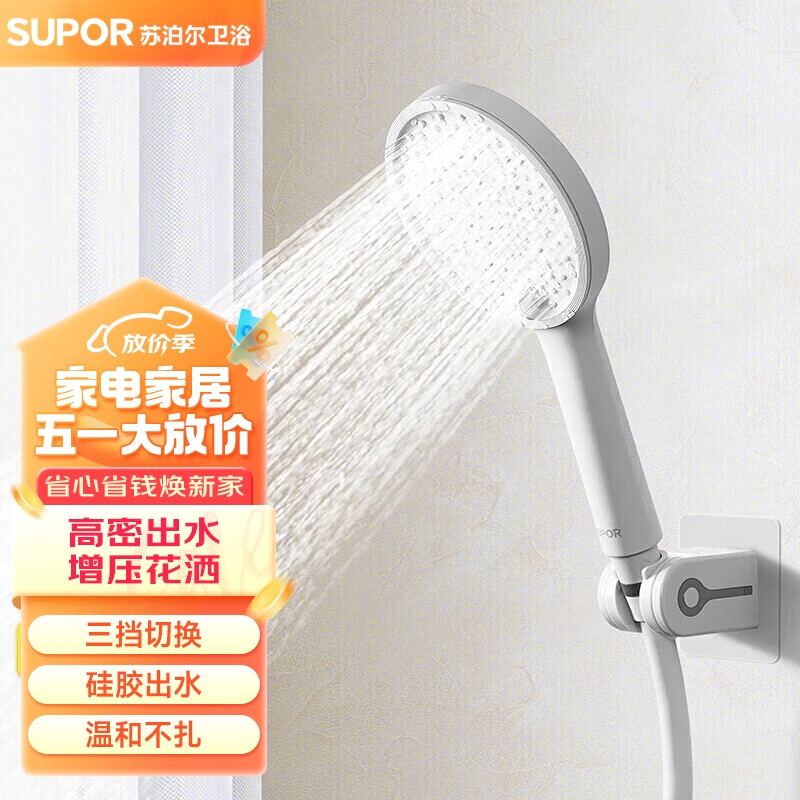苏泊尔(SUPOR)增压花洒套装淋浴手持喷头三件套含莲蓬头+软管+免钉支架 白色价格:119.00元!