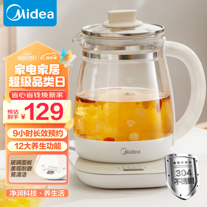 美的(Midea)养生壶 玻璃面板煮茶器 烧水壶 煮茶壶热水壶 办公室1.5L大容量恒温保温玻璃养生壶 YSNC1501A价格:129.00元!