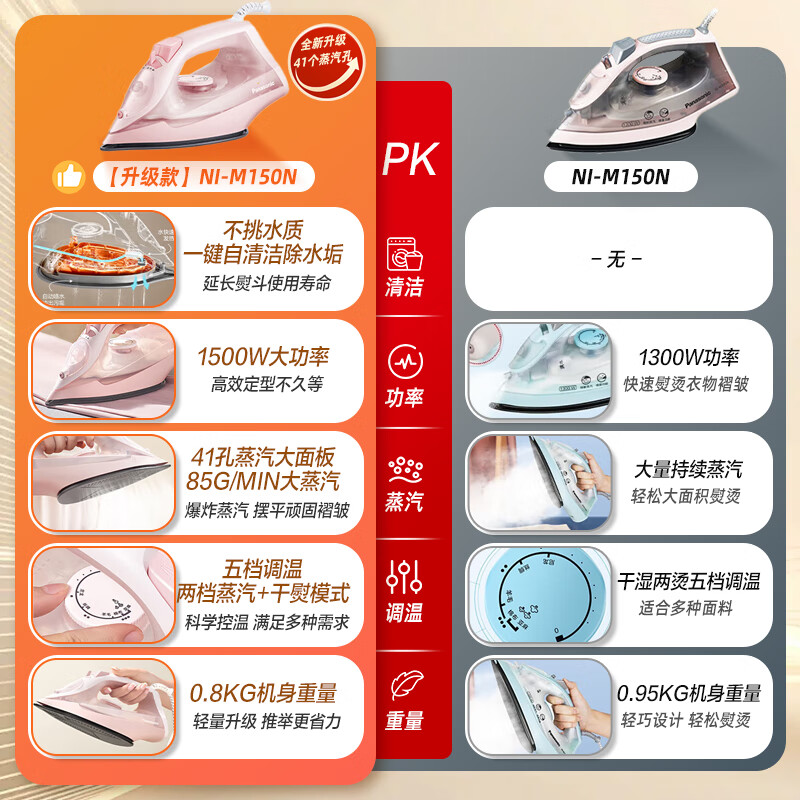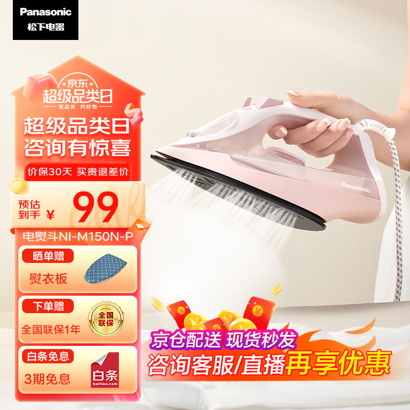 松下 电熨斗家用小型手持干湿熨烫平烫喷雾喷射蒸汽快速除皱不沾底板 NI-M150N-P 粉色价格:99.00元!