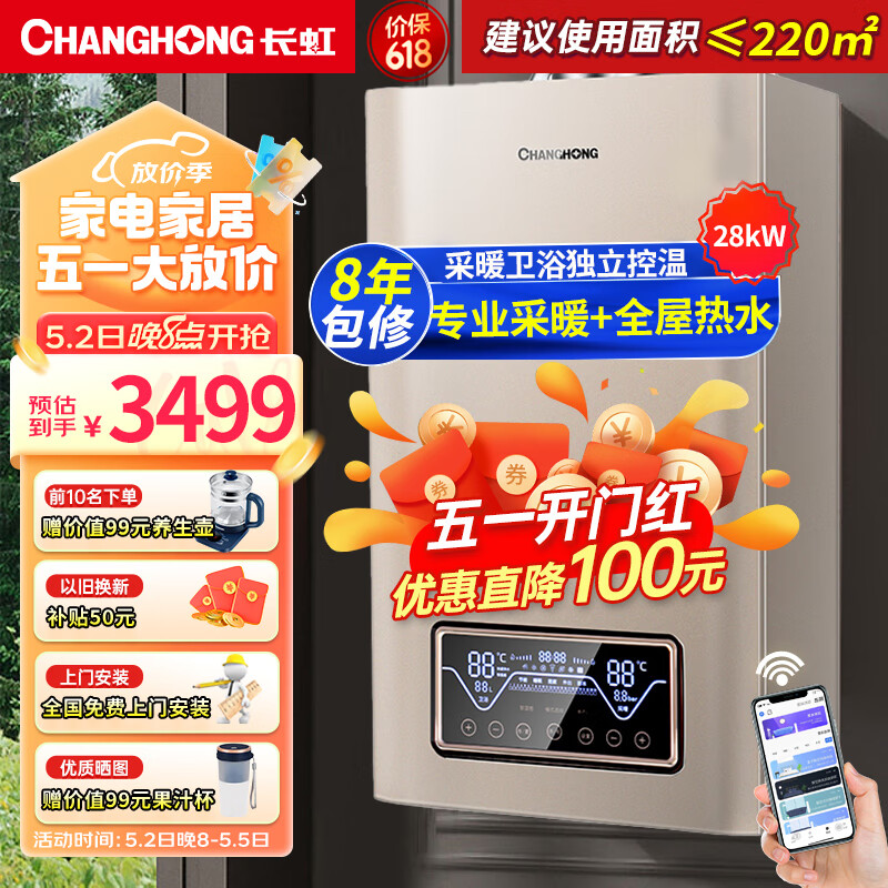 长虹(CHANGHONG)燃气壁挂炉家用天然气双温双控供暖淋浴APP智控多段式燃烧锅炉供暖暖气地暖热水两用恒温28BQ01价格:4999.00元!