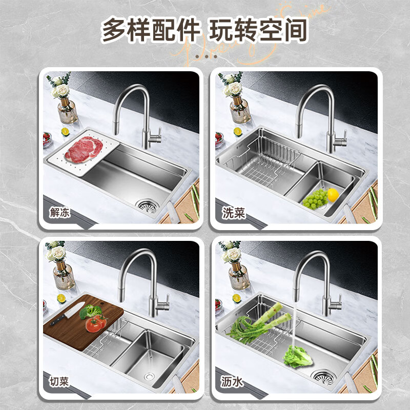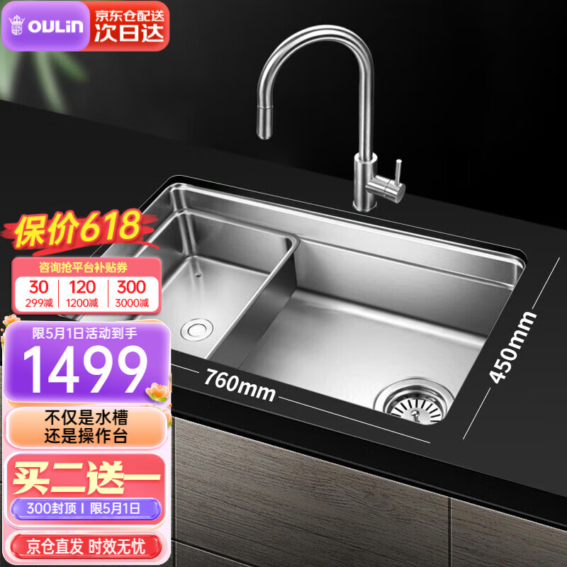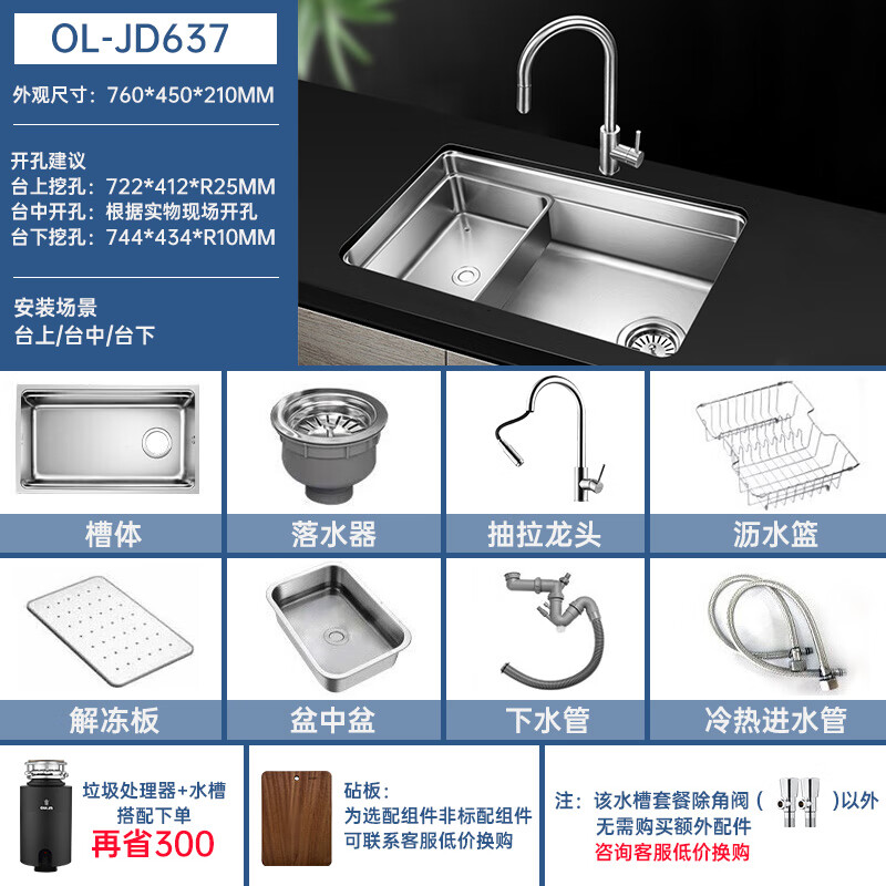 欧琳(OULIN)不锈钢水槽单槽 厨房洗菜盆单槽 台下盆配不锈钢抽拉龙头OLJD637价格:1619.00元!