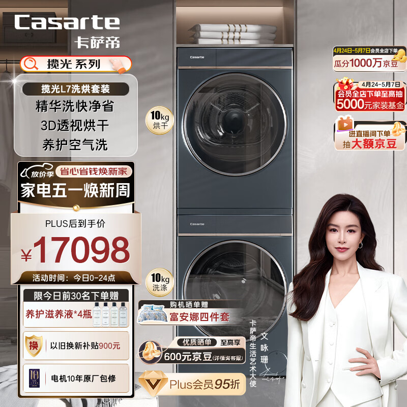 卡萨帝(Casarte)揽光L7洗烘套装 精华洗滚筒全自动+双擎热泵烘干机 超薄平嵌3D透视烘干 纤诺D10L7ELU1+10FL7EU1价格:17998.00元!
