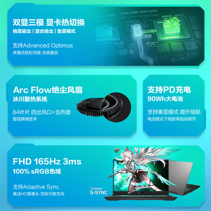 5、京东快递速度快,外观:很漂亮很好看,键盘灯花里胡哨,青色外壳适合女孩子1画面品质:2.5k屏幕很亮眼,240w适配器太大太重了1跑分评测:暂时没跑分。西数硬盘C盘90G三二下就满了。以后看情况再加个固态硬盘。1运行速度:运行正常,立体声音的话感觉也就那样,看电影不卡顿,鼠标有时会消失,会不动,换个鼠标再看看。用的老路由器下载速度在八兆左右,感觉一般。
