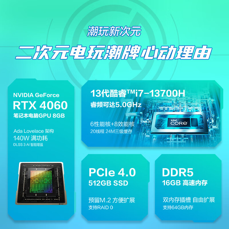 3、看网上测评,英特尔酷睿i7-13700h标压处理器,4060显卡,跑分很高。开箱验机,速度确实快,又升级了内存硬盘,一步到位,打算多用几年。