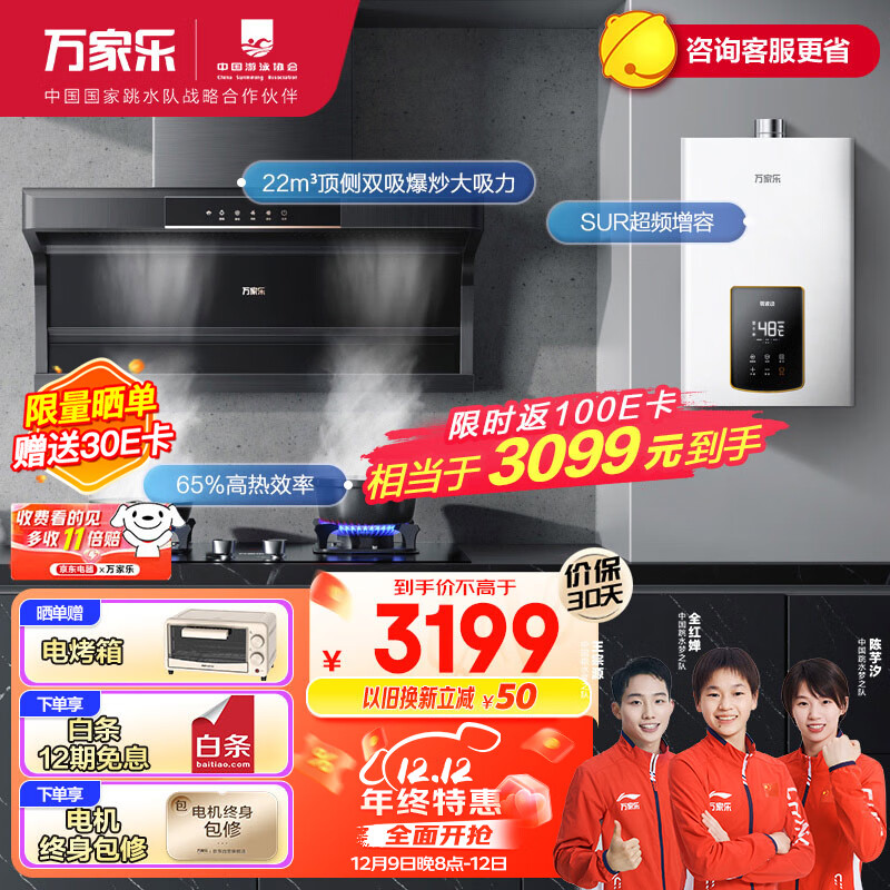 万家乐烟灶热水器套装 顶侧双吸油烟机16L水伺服智能变升热水器厨房三件套AK5+KV061B+16D6S天然气价格:3399.00元!