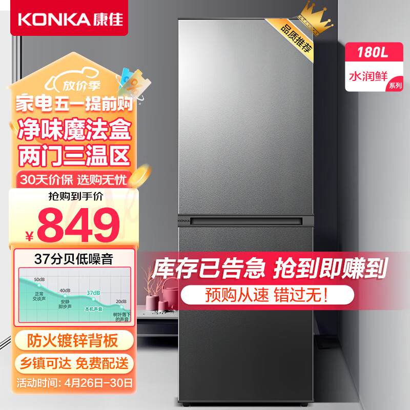 康佳180升两门双门二门冰箱节能低噪小型家用电冰箱三温区迷你小巧不占地两天仅约一度电BCD-180GY2S价格:849.00元!