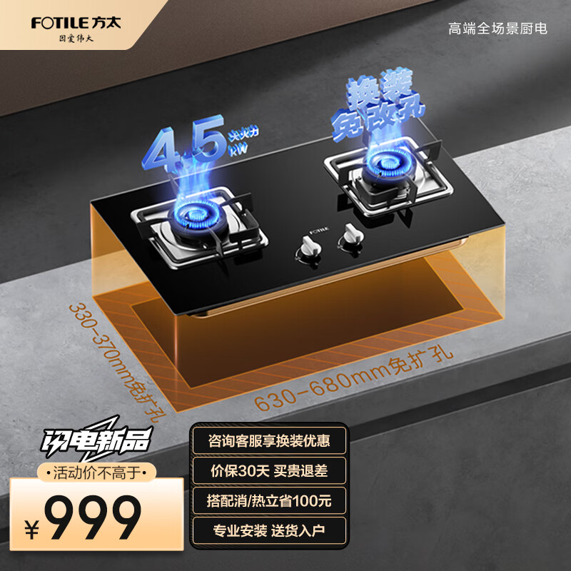 方太(FOTILE)方太燃气灶(天然气)家用嵌入式猛火双灶具煤气灶 4.5kW*一级能效 换装不改孔02-TH33B价格:999.00元!