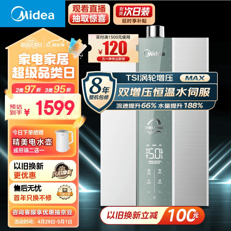 美的(Midea)16L燃气热水器 天然气 TSI涡轮增压水伺服 智控增压恒温 ECO节能磁净化健康洗JSQ30-MK6 Max价格:1599.00元!