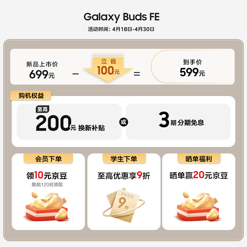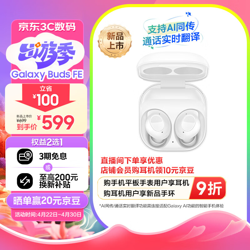 三星Galaxy Buds FE 真无线蓝牙耳机智能降噪运动耳机/AKG调教/出众音质/持久续航/舒适佩戴 雪境白价格:599.00元!