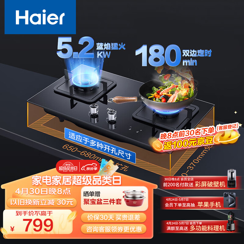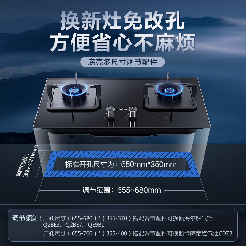 海尔(Haier)燃气灶天然气 家用双灶具5.2kW瞬燃猛火 180min智能定时 以旧换新搭配可调节底壳Q2BE7(12T)价格:799.00元!