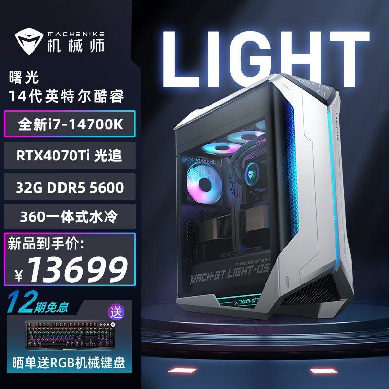 机械师(MACHENIKE)曙光 游戏台式机电脑电竞主机(14代i7-14700K 32G DDR5 5600 1TSSD RTX4070Ti)360水冷价格:13999.00元!