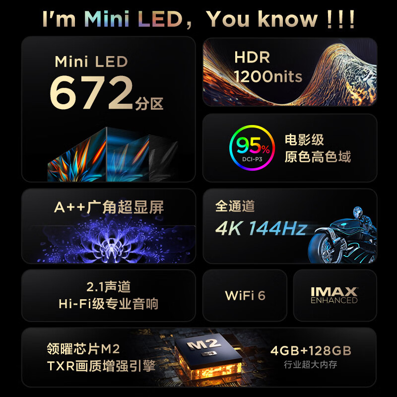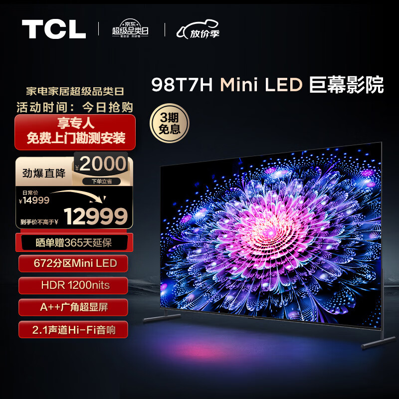 TCL电视 98T7H 98英寸 Mini LED 672分区 HDR 1200nits 4K 144Hz 2.1声道音响 液晶智能平板电视机100价格:12999.00元!