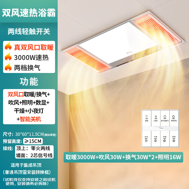 功能:负离子净化,定时关机,风暖,照明,换气,数字显示,吹风