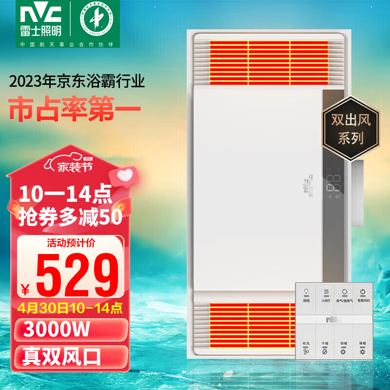 雷士(NVC)双风口取暖/换气风暖浴霸排气扇照明一体卫生间暖风机取暖器Y276价格:769.00元!