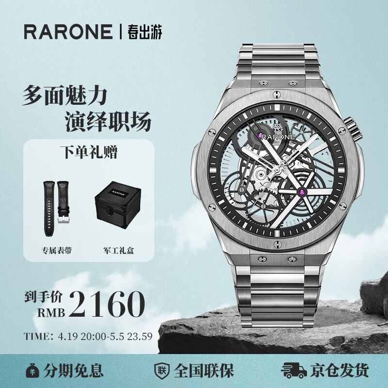 雷诺(RARONE)双子星X时轮全景镂空机械表夜光国表男士腕表钢带520情人节礼物价格:2399.00元!