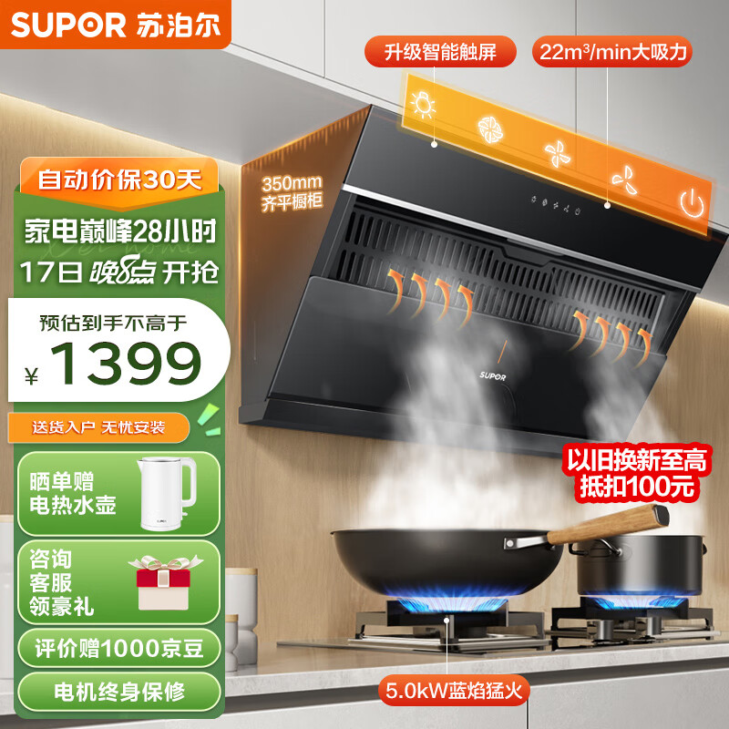 苏泊尔(SUPOR)抽油烟机侧吸式?爆炒22立方大吸力?家用吸油烟机?450pa强劲风压油烟机燃气灶套装?DJ11+DB27天价格:1399.00元!