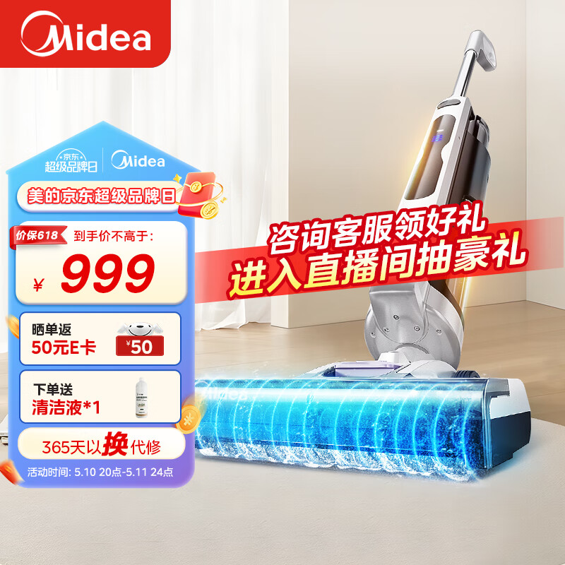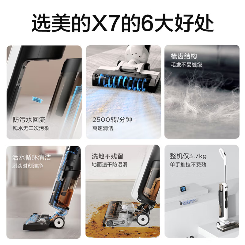 美的(Midea)洗地机X7 轻量无线智能深度清洁洗地机2.0 除菌吸尘 吸拖洗扫一体拖地机 美的无尘感洗地机价格:999.00元!