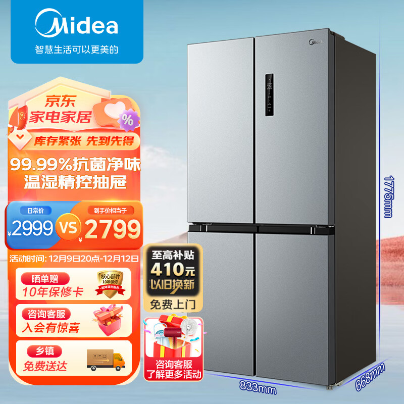 美的(Midea)慧鲜系列480升变频一级能效十字四开门双开对开门风冷超薄大容量囤货智能冰箱 BCD-480WSPZM(E)价格:2999.00元!
