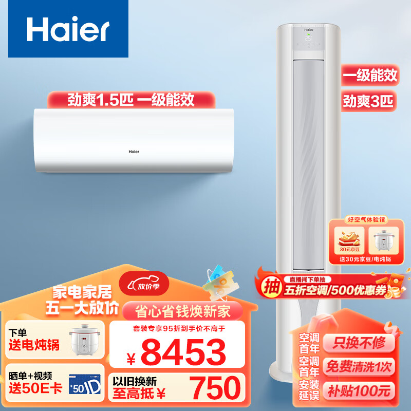 海尔(Haier)劲爽系列 冷媒变流 新一级变频冷暖空调 一室一厅空调套装 (1.5匹挂机+3匹柜机) 以旧换新价格:8453.00元!