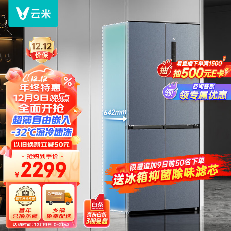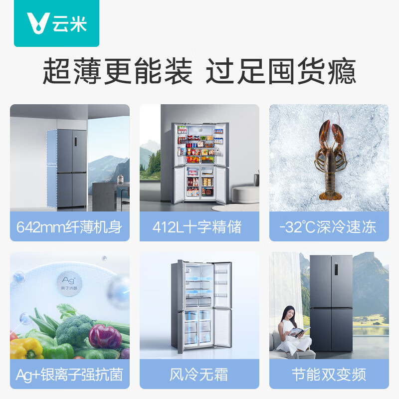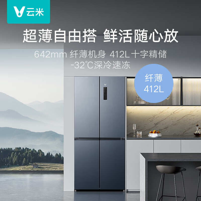 云米(VIOMI)412升家用十字对开门冰箱杀菌净味超大容量风冷无霜保鲜变频超薄冰箱BCD-412WMSAZ04价格:2299.00元!