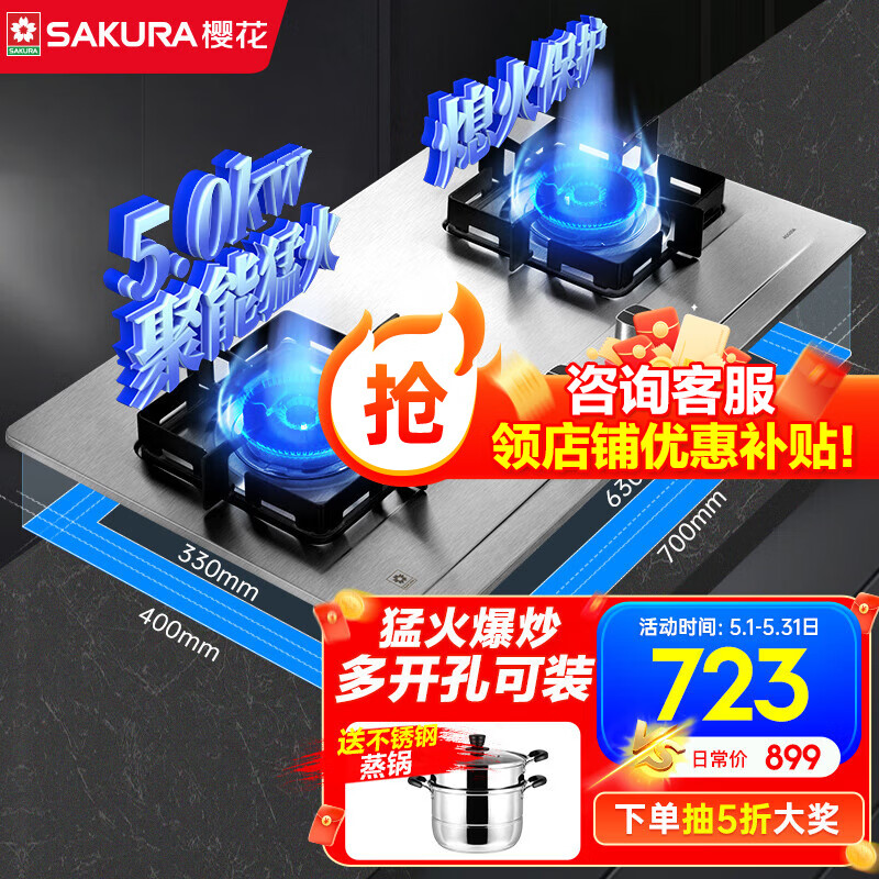 樱花(SAKURA)燃气灶天然气煤气灶双灶液化气家用台嵌两用家用不锈钢灶台一级能效大尺寸多开孔猛火灶 ADG05A 液化气5KW大火力可调节底盘价格:899.00元!