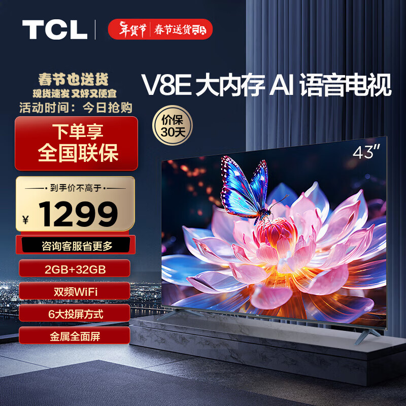TCL电视 43V8E 43英寸 2+32GB 双频WiFi 平板电视机 以旧换新价格:1299.00元!