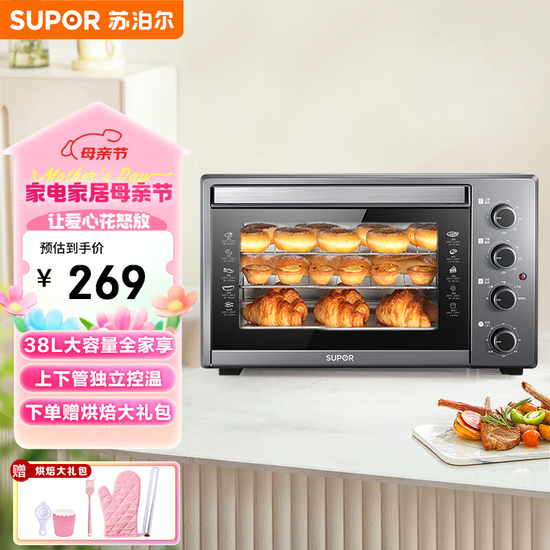苏泊尔 (SUPOR)家用多功能电烤箱 38L大容量 上下独立控温低温发酵多层烤位易操作 钢灰色 K38FK613价格:259.00元!