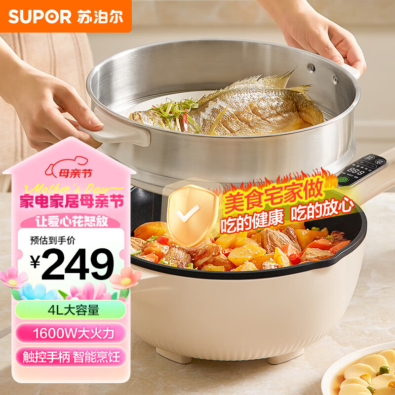 苏泊尔(SUPOR)电炒锅 电蒸锅 电煮锅 家用多功能电火锅 蒸煮炒菜 4升多用途锅 CD28A823配蒸屉价格:249.00元!