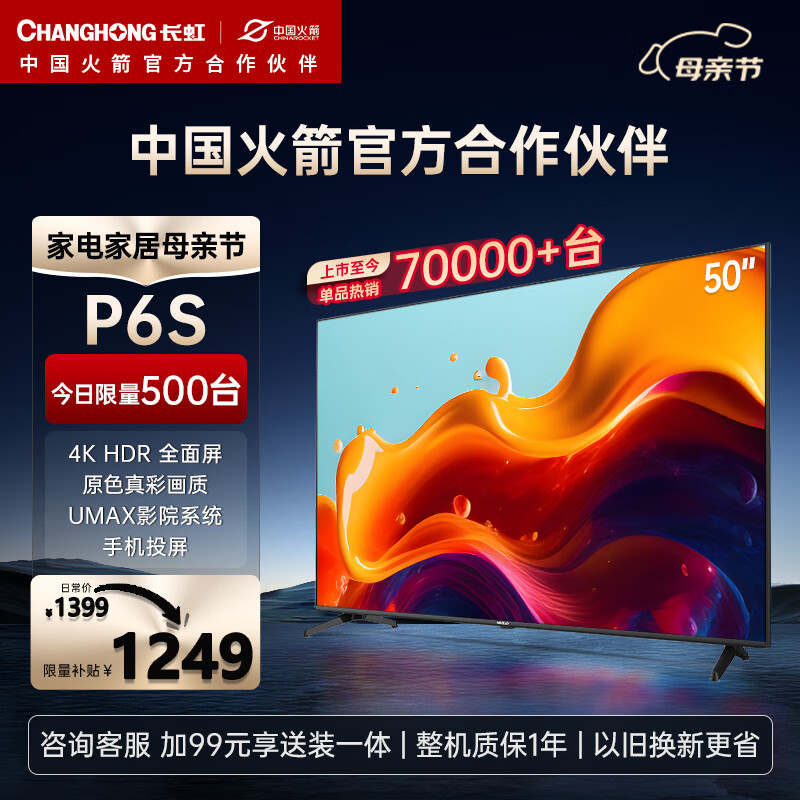 长虹电视50P6S 50英寸智能 4KHDR 手机投屏 屏平板液晶LED电视机(黑色)价格:1249.00元!