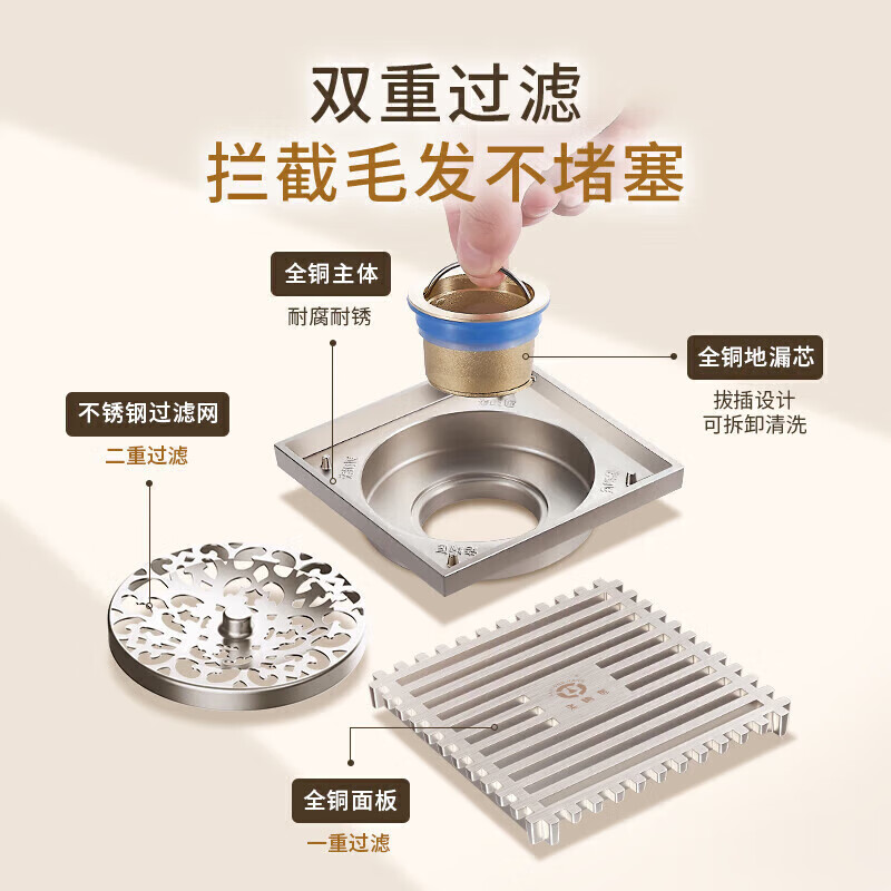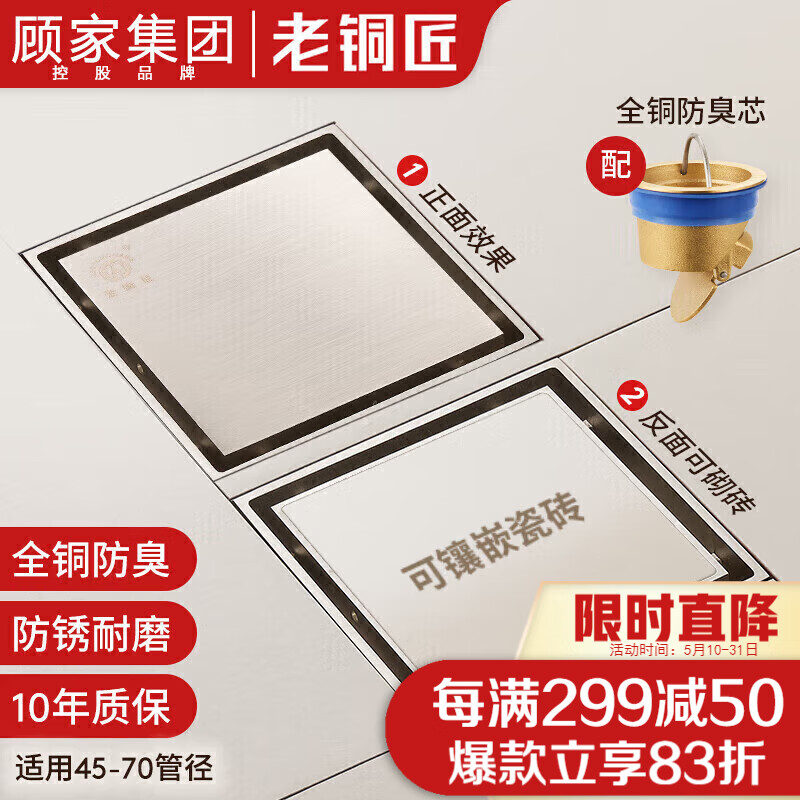 老铜匠顾家集团全铜防臭地漏 方形可嵌砖隐形地漏淋浴房阳台 隐形地漏价格:106.49元!